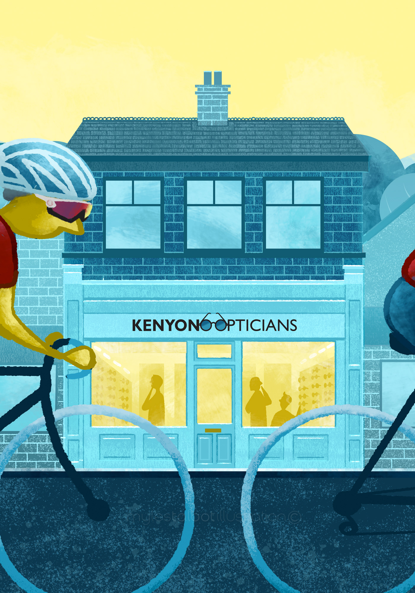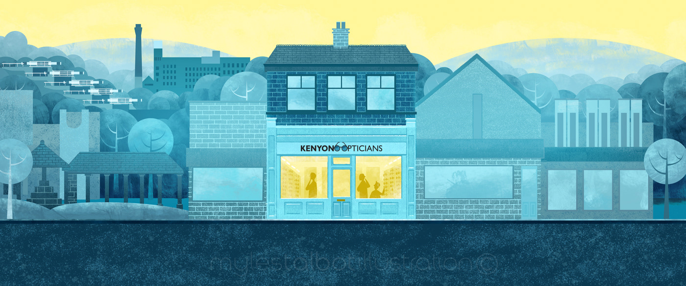 A great little project for our local optician Kenyon, who is an independent practice and part of the fabric of Bingley. The opening scene is based on Bingley high street with the shop taking centre stage. In the scene we can see the famous 5 Rise Locks, Damart clothing factory, Bingley Arts Centre and the historic Buttercross market place. The quirky characters pass busily along the highstreet wearing all the latest eyewear fashion purchased from the shop.